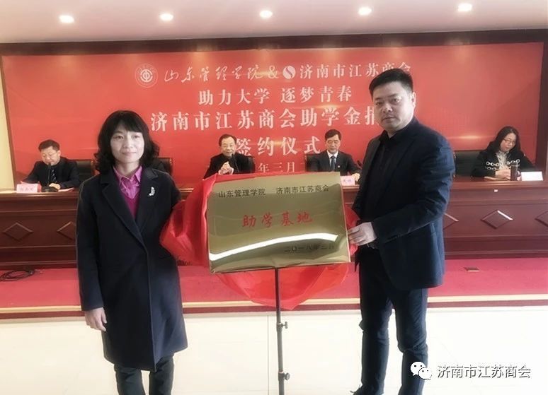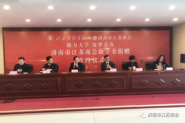 3月21日上午,济南市江苏商会在山东管理学院会议室隆重举行捐资助学签约仪式暨助学基地揭牌仪式!济南市民政局副局长李越千,济南市工商联副主席韩光美,济南市社会组织管理处处长韩化莉,山东管理学院党委书记冯庆禄,山东管理学院副院长杨西国,济南市江苏商会会长史先柱在主席台就座。商会三十余位爱心企业家参加活动。