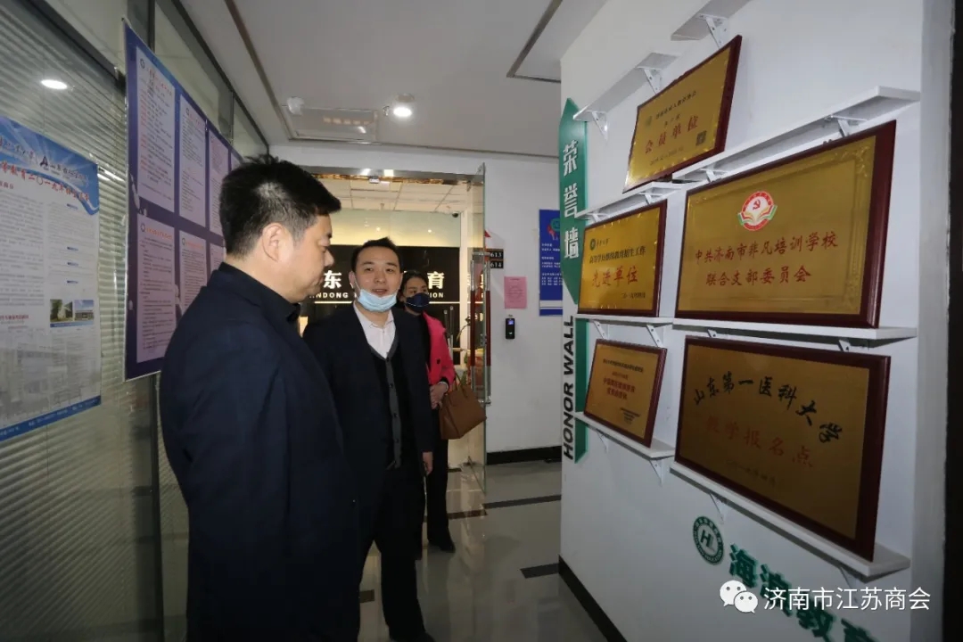 海浪教育(山东)集团有限公司总经理张庆贺(图右)热情接待商会一行,他说:自己是江苏徐州人,此次通过商会副会长周建(老乡)的推荐,经济南市江苏商会的审批同意,能够光荣的加入商会,感到非常高兴。随后,张总向大家介绍了公司的情况;该公司是经国家工商部门批准的现代化专业教育培训机构,下设济南市非凡培训学校、山东海浪人力资源有限公司、济南市历城区海浪教育培训学校有限公司,坐落于美丽的泉城济南。主要致力于成人教育、网络教育。以人为本,为广大学员提供良好的学习机会与提升学历的平台。是一家专注于成人高考、移动互联网、在线教育的专业机构,积累了多年的教育经验,培养了大批优秀本科毕业生,业绩骄人,行业领跑者。同时,本机构配备顶级的教育资源,现代化的教学设备,师资力量雄厚,教师全部具有一线实操经验及教学经验。