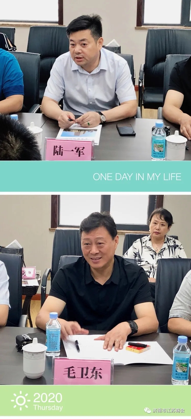2020年8月12日下午,济南市江苏商会执行会长兼秘书长陆一军,常务副会长、建筑业联合会会长毛卫东,副会长陈业飞、周延平、高庆春、韩国俊,副监事长陈小杰,理事周梅芳,会员周莉娟,副秘书长杜蔚然、办公室主任吴山、会员部部长马文娟等一行走访商会副会长陶卫军的企业--山东建大景园科技有限公司,陶会长对商会一行的到来表示热烈欢迎。